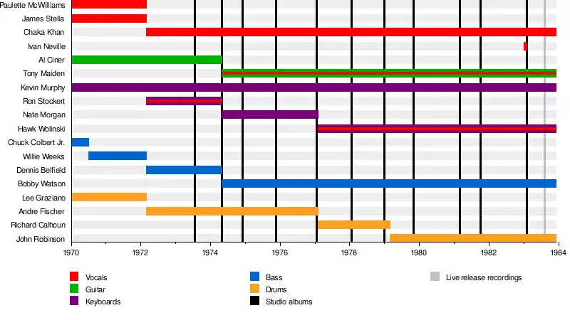 Rufus is an American funk band from Chicago, Illinois, best known for launching the career of lead singer Chaka Khan.[1] They had several hits throughout their career, including "Tell Me Something Good", "Sweet Thing", "Do You Love What You Feel" and "Ain't Nobody". Rufus and Chaka Khan were one of the most popular and influential funk bands of the 1970s, with four consecutive number one R&B albums, ten top 40 pop hits and five number one R&B singles, among other accolades.