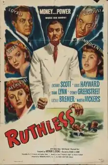 Ruthless is a 1948 American film noir drama film directed by Edgar G. Ulmer starring Zachary Scott, Sydney Greenstreet and Louis Hayward.[1]