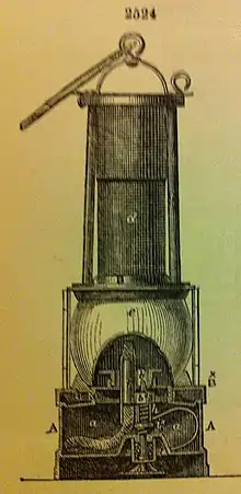 Improper use of safety lamps defeated the purpose of the safety lamp and caused risk. When the flame went out in a lamp there was a temptation for the collier to open and relight it. Some opened the lamps to light tobacco pipes underground.[20] Both of these practices were strictly forbidden. The miner was expected to return to the shaft, a round trip of up to a few miles, to relight an extinguished lamp. For men on piece work paid for what they produced, a relighting could cost them perhaps 10% of their day's pay, encouraging them to take the risk. To prevent dangerous relighting (or opening the lamp to light a pipe), from the mid-century onwards, and particularly after the 1872 act, lamps had to have a lock mechanism which prevented the miner opening the lamp. Two schemes existed: either a special tool was required which was kept at the pit head, or else opening the lamp extinguished the flame. The latter mechanism can be seen in the Mueseler, Landau, and Yates lamps below. Such a lamp was known as a protector lamp, a term picked up and used as a company name.[21] Only on the return to the bank could the lamp man open the lamp for refilling and service. Various different locking mechanisms were developed; miners tended to be ingenious in finding ways of circumventing them. A number of additional lit lamps were supposed to accompany each gang of men, but restricting the number was an obvious economy for the pit owners.