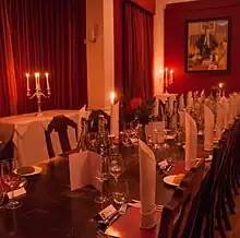 The college has Formal Hall—a formal three or four course dinner served with wine—once a week.[42] Students wait for Senior Members to come into High Table and Grace is said in Latin by the presiding fellow, usually the Principal, immediately prior to the meal: Benedic nobis, Domine Deus, et his donis, quae ex liberalitate Tua sumpturi sumus, per Jesum Christum Dominum nostrum. Amen.