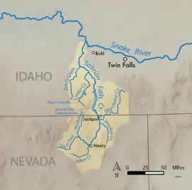 Salmon Falls Creek is a tributary of the Snake River, flowing from northern Nevada into Idaho in the United States. Formed in high mountains at the northern edge of the Great Basin, Salmon Falls Creek flows northwards 121 miles (195 km),[3] draining an arid and mountainous basin of 2,103 square miles (5,450 km2). The Salmon Falls Creek valley served as a trade route between the Native American groups of the Snake River Plain and Great Basin. Today, most of its water is used for irrigation.