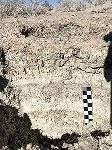 Just outside the community, there is a dry salt pan called Salt Flat Playa or Salt Basin. It straddles the New Mexico-Texas border and is approximately 150 miles long, and five to 15 miles wide, making it one of the largest gypsum playas in the United States. The playa occupies the north-south oriented Salt Basin Grabben, which lies between the Guadalupe and Delaware Mountains on the east and the Sierra Diablo and Diablo Plateau on the west. The playa was originally a lake during the late Pleistocene epoch, but drying of the climate since then has left a salt pan.[4] Today, a briny water table is about three feet below the surface. Capillary evaporation in the dry, hot weather pulls brine upwards and evaporite (gypsum, halite) and carbonate (calcite, dolomite) minerals precipitate.[4] Cyanobacteria (blue-green algae) grow on the surface and immediately below the surface when the playa is wet. Alternating light and dark bands are either gypsum-rich (light) or dolomite-rich (dark)[5] When the playa is dry during the summer, winds blow the gypsum into sand dunes.