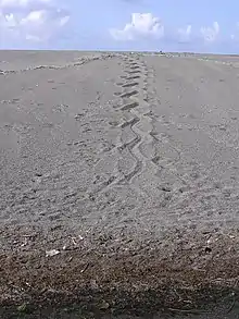 Saltwater crocodiles use ocean currents to travel long distances. In Australia, 20 crocodiles were tagged with satellite transmitters; 8 of them ventured out into open ocean, and one of them traveled 590 km (370 mi) along the coast in 25 days from the North Kennedy River on the eastern coast of Far North Queensland, around Cape York Peninsula, to the west coast in the Gulf of Carpentaria. Another individual swam 411 km (255 mi) in 20 days. Without having to move around much, sometimes simply by floating, the current-riding behaviour allows for the conservation of energy. They interrupted their movements and resided in sheltered bays for a few days until the current changed direction. Sometimes, they also swam up and down river systems.[93] Generally very lethargic, a trait that helps it survive months at a time without food, the saltwater crocodile will usually loiter in the water or bask in the sun during much of the day, preferring to hunt at night. A study of seasonal saltwater crocodile behaviour in Australia indicated that they are more active and more likely to spend time in the water during the Australian summer; conversely, they are less active and spend relatively more time basking in the sun during the winter.[97] Saltwater crocodiles, however, are among the most active of all crocodilians, spending more time cruising and active, especially in water. They are much less terrestrial than most species of crocodiles, spending less time on land except for basking. At times, they tend to spend weeks at sea in search of land and in some cases, barnacles have been observed growing on crocodile scales, indicative of the long periods they spend at sea.[98]