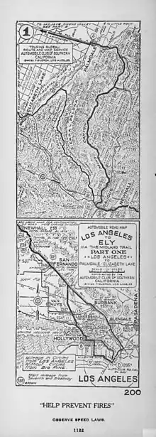 Los Angeles County realigned most of the upper part of San Francisquito Canyon Road in the 2000s. The original narrowest and curviest segment remains.[3] The bypassed old section is a hiking route along San Francisquito Creek, passing through the historic St. Francis Dam site and ruins.