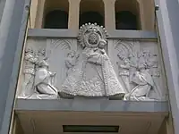 The church façade has receding planes with leaves designed in corbel arches. Over the triple portals of the church is a high-relief frieze depicting the story of La Naval de Manila. The giant bas-relief of Santo Domingo was designed by the Italian sculptor and expatriate Francesco Monti.[4][5]
