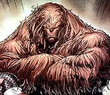 A race of Sasquatches were discovered to live in the forests of British Columbia. They are first seen in Alpha Flight vol. 2 #1.[47] Once a year, the Sasquatches gather at the City of Sasquatches in secret, where they worship their forgotten gods and breed with one another.[48] One of these Sasquatches, a barely intelligent monster, is mistaken by Langkowski's teammates to be a highly degenerated Langkowski, but it was an actual Bigfoot that had been captured by Department H. He is kept in control by the touch of the superpowered Murmur, though not always successfully.[47] This Sasquatch dies in a conflict with Department H's corrupt leadership and the Zodiac.[49]