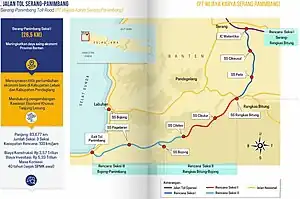- ↑ Jayasantika, Yadi (3 October 2021). "Membelah Tiga Kabupaten, Jalan Tol Serang - Panimbang Akses Cepat Pertama di Banten Selatan, Ini Profilnya" [Crossing three regencies, Serang-Panimbang Toll Road the first express access to South Banten, the profile]. Kabar Banten (in Indonesian). Indonesia. Retrieved 19 July 2022.