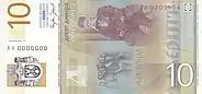 10 dinars obverse Ochre-yellow Vuk Stefanović Karadžić (1787 1864), philologist and linguist Member of the First Prague Slavic Congress, 1848 and a vignette of the letters Vuk introduced. Replaced with a slightly lighter 2006 issue. A revised issue entered circulation in 2011.