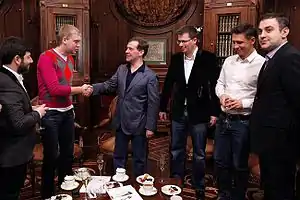 Sergei Yuryevich Svetlakov (Russian: Серге́й Ю́рьевич Светлако́в; born 12 December 1977) is a Russian comedian, film and television actor, TV host, producer, screenwriter. Member of the KVN team "Ural pelmeni" (2000–09). He is best known for appearing in the sketch-show Nasha Russia and his role as Evgeniy Pavlovich in the Yolki franchise.[1]