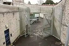 The Americans constructed a small, two-storey building containing a gallows (of identical design to those used in British prisons) adjoining one of the prison wings.[50] The flat-roofed execution block has a single window, approximately one metre above the trap-door. There is an external wooden door on the ground floor which gives access to the area underneath the trapdoor. It was through this door that the bodies of executed prisoners were removed. The barred steel mortuary door, located below C wing, directly faces the external wooden door to the execution block. The execution block is sandwiched tightly between two much larger buildings, close to the rear of the prison. Visually, it clashes with the other architecture because it is made of red brick, whereas the rest of the prison is constructed from stone.[51][52]