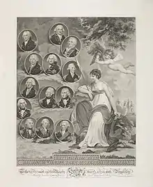 He took this opportunity to resume his parliamentary career, being elected to the constituency of Tregony on 5 April 1784, holding the seat until 1790.[8][10] He does not appear to have ever spoken in parliament, but records show that he voted in favour of William Pitt over his 1785 Reform Bill, against him during the Regency crises of 1788 and 1789, and against the Duke of Richmond's fortification plans in 1786.[8] The Nootka Crisis in 1790 brought an end to his career in politics, as Kingsmill returned to active duty in command of the 90-gun HMS Duke.[8][11] The crisis passed without breaking into open war, and Kingsmill paid off Duke and once again entered semi-retirement.[8] In October 1790, he was selected to serve as a member of the panel of officers at the court-martial concerning the mutiny and loss of HMS Bounty.[12] As contemporaries in the service, Sir Robert and Horatio Nelson developed a close friendship that lasted until Nelson's death at Trafalgar on 21 October 1805.[13]