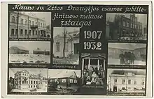 The Society of Saint Zita in Kaunas was organized separately by priests Povilas Dogelis and Juozapas Jarašiūnas (government permissions for societies were given separately in each governorate).[5] It was officially registered on 3 July 1907,[2] and Jarašiūnas was elected its chairman.[7] It had 315 members in 1907 and about 600 members in 1912.[1] Other sections were organized in Panevėžys, Šiauliai, Ukmergė, Raseiniai, Zarasai[1] as well as in Riga (1910) and Saint Petersburg (1914).[5] The section in Panevėžys was closed by Russian authorities in 1912.[1] After Lithuania regained Independence in 1918, the society spread more widely across Lithuania; e.g. section in Telšiai was established in 1919.[8] The society constructed its four-storey headquarters (architect Feliksas Vizbaras) in 1925 at a cost of 400,000 litas (present-day Theological Faculty of Vytautas Magnus University).[9] The society was closed on 10 September 1940 by the Council of People's Commissars of the Lithuanian SSR.[8]