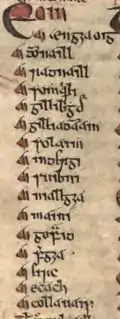 - ↑ Many of the sources trace Somerled's lineage to Fergus Mór, a legendary king of Dál Riata; and more trace Somerled's line further back to Colla Uais, a legendary Irish king.[12] With the exception of these figures, and other somewhat legendary figures who are listed as Somerled's earliest ancestors, the historicity of the other men in the traditional lineage beyond his grandfather cannot be corroborated. Solam appears as Somerled's great-grandfather in the more authoritative sources, which suggests that his placement may well be accurate.[17] Solam's name is rather unusual, although not unattested for other individuals in other sources; as such, its occurrence in Somerled's traditional lineage could be evidence of its accuracy.[18]