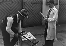 A man recording the sound of a saw in the 1930s