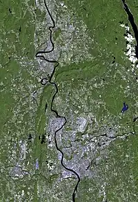 According to the United States Census Bureau, the city has a total area of 33.1 square miles (85.7 km2), of which 31.9 square miles (82.5 km2) are land and 1.2 square miles (3.1 km2), or 3.65%, are water.[35] Once nicknamed "The City in a Forest", Springfield features over 4.0 square miles (10.4 km2) of urban parkland, 12% of its total land area.[36]