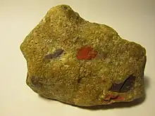 A creation of Precambrian rivers and later metamorphism, "St. Joseph Island puddingstone" is distinctive for its bright red and brown jasper pebbles suspended in white quartzite. This form of jasper conglomerate can be found in deposits around the island and surrounding areas including Drummond Island having been scraped from formations in the Bruce Mines area and deposited as glacial erratics.