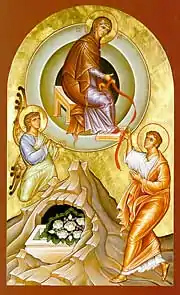 Depiction of the Soonoro giving her Girdle to Thomas the Apostle. Below is a styllized representation of Mary's Tomb, with flowers lying on the sarcophagus.