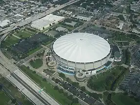 Development of the first Major League Baseball team to be located in the Tampa Bay area began in St. Petersburg throughout the 1970s. The city tried to encourage numerous teams through the United States to make St. Petersburg their new home.[14] Designs for a ballpark were first presented in 1983 and construction for a permanent dome stadium began in 1986.[53] This process controversially required the demolition of the mostly-Black Gas Plant neighborhood. The stadium opened in 1990 as the Florida Suncoast Dome, renamed the Thunderdome in 1993. After many attempts to attract tenants to the new stadium, Major League Baseball gave St. Petersburg a franchise in 1995. In 1996, the dome was renamed a third time to Tropicana Field after naming rights were established with Tropicana Dole Beverages.[54] The Tampa Bay Devil Rays was then established in 1998 after the stadium's renovation and the new team played their first game on March 31, 1998, giving the Tampa Bay area their first professional baseball team.[55]