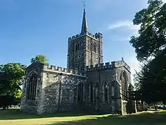 Nikolaus Pevsner described St. Mary's as "a big and noble church".[5][6] This Early English church was laid out c.1220 in an original cruciform floorplan with a central tower topped with a lead flèche, a typical example of a Hertfordshire spike.[3] The exterior is faced with flint and has Totternhoe stone dressings, and the walls are topped with decorative crenellations which were added in the 19th century.[6]