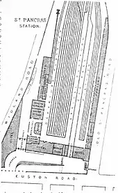 The main economic justification for the MR extension was for the transport of coal and other goods to the capital, which was hindered by a 1s 9d toll on GNR lines.[19] A large goods station was constructed between 1862 and 1865, sited to the west of the King's Cross coal depot between the North London Railway and the Regent's Canal.[17] Although coal and goods were the main motivation for the London extension, the Midland realised the prestige of having a central London passenger terminus and decided it must have a front on Euston Road. The company purchased the eastern section of land on the road's north side owned by Earl Somers.[17]