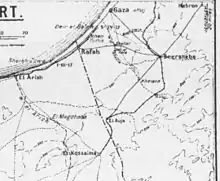The British suffered nearly 4,000 casualties during the first battle for Gaza,[7] and more than 6,000 casualties during the second.[8] These casualties had to be managed, with the dead buried and their personal effects stored or sent home, and the wounded cared for.[9] Meanwhile, the EEF's railway, which had reached Deir el Belah before the second battle of Gaza, was extended by a branch line to Shellal.[3]