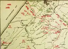 To the west of the Wadi Ghazza a reserve line along the old battle line was held by one infantry brigade. To the east of the Wadi Ghazza, the front line consisted of 25 redoubts manned by one platoon in each redoubt, except redoubts 2, 11, and 12, which each had two platoons. These redoubts, fronted by continuous wire entanglements, formed the firing line between Gamli and Hiseia 12,000 yards (11,000 m) to the north. In addition, the front line was strengthened by a support line of trenches, located 300 yards (270 m) behind the firing line, along the east bank of the Wadi Ghazza. Continuous wire entanglements with gaps for the main roads stretched for 11,000 yards (10,000 m) south. This battle line was held by one infantry division, which deployed in the front line one brigade and one artillery brigade, the latter located along the west bank of the Wadi Ghazza, from which the guns could "sweep the ground in front of the battle line."[44]