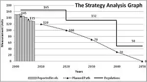 The strategy analysis graph shows the subject company's planned path for dealing with the ESI, tangible progress made, and if existent, government regulations. The trajectory of the subject company's planned path reveals the extent of their future risk exposure. This graph is placed in the center of the strategy analysis page.