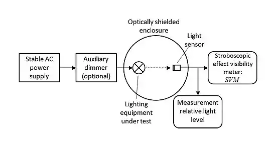 For objective assessment of stroboscopic effect the stroboscopic effect visibility measure (SVM) has been developed.[5][6][10]  The specification of the stroboscopic effect visibility meter and the test method for objective assessment of lighting equipment is published in IEC technical report IEC TR 63158.[11] SVM is calculated using the following summation formula: