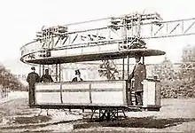 The Enos Electric Railway, an electric-powered monorail with wagons suspended from an elevated frame of open steelwork, was demonstrated in the grounds of the Daft Electric Company in Greenville, New Jersey, in 1886. It was built out of lightweight steel construction and worked well, but was never expanded.[5][6]