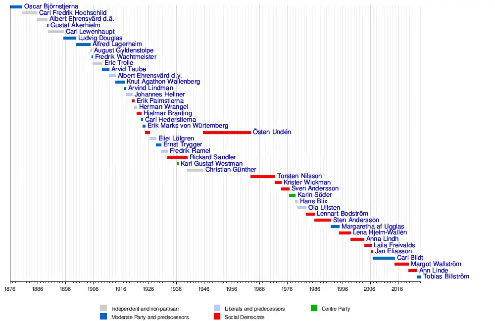 The current Minister for Foreign Affairs is Tobias Billström of the Moderate Party.
