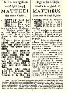 The opening paragraphs of the Gospel of Matthew in bilingual parallel format, from the first half of the 17th century, in the Dutch and Sinckan languages. (Campbell & Gravius (1888). The Gospel of St. Matthew in Formosan)