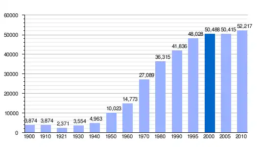 Taxco's population as of 2010 was 52,217 (in 13,933 households), of whom 48% were men and 52% were women.[7][8] Taxco's population grew rapidly from 1950 (10,023) to 2000 (50,488).[8]