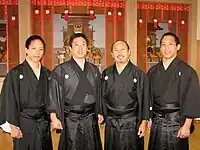 Tenrikyo service performers wearing traditional montsuki kimono after a monthly service.