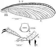 The oldest unambiguous termite fossils date to the early Cretaceous, but given the diversity of Cretaceous termites and early fossil records showing mutualism between microorganisms and these insects, they possibly originated earlier in the Jurassic or Triassic.[30][31][32] Possible evidence of a Jurassic origin is the assumption that the extinct mammaliaform Fruitafossor from Morrison Formation consumed termites, judging from its morphological similarity to modern termite-eating mammals.[33] Morrison Formation also yields social insect nest fossils close to that of termites.[34] The oldest termite nest discovered is believed to be from the Upper Cretaceous in West Texas, where the oldest known faecal pellets were also discovered.[35] Claims that termites emerged earlier have faced controversy. For example, F. M. Weesner indicated that the Mastotermitidae termites may go back to the Late Permian, 251 million years ago,[36] and fossil wings that have a close resemblance to the wings of Mastotermes of the Mastotermitidae, the most primitive living termite, have been discovered in the Permian layers in Kansas.[37] It is even possible that the first termites emerged during the Carboniferous.[38] The folded wings of the fossil wood roach Pycnoblattina, arranged in a convex pattern between segments 1a and 2a, resemble those seen in Mastotermes, the only living insect with the same pattern.[37] Kumar Krishna et al., though, consider that all of the Paleozoic and Triassic insects tentatively classified as termites are in fact unrelated to termites and should be excluded from the Isoptera.[39] Other studies suggest that the origin of termites is more recent, having diverged from Cryptocercus sometime during the Early Cretaceous.[4]