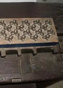 This process is the earliest, simplest and slowest of all printing methods. A design is drawn on, or transferred to, prepared wooden blocks. A separate block is required for each distinct colour in the design. A block cutter carves out the wood around the heavier masses first, leaving the finer and more delicate work until the last so as to avoid any risk of injuring it when the coarser parts are cut. When finished, the block has the appearance of a flat relief carving, with the design standing out. Fine details, difficult to cut in wood, are built up in strips of brass or copper, which is bent to shape and driven edgewise into the flat surface of the block. This method is known as coppering.[1]