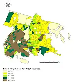 Despite significant investment compared to the post war period, many exacerbated social problems remain including high rates of violent crime, substance abuse, overcrowding, and substandard housing conditions.[93][94][95][96] The Bronx has the highest rate of poverty in New York City, and the greater South Bronx is the poorest area.[97][98]