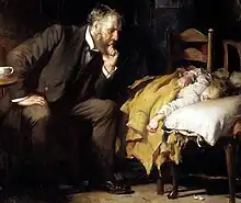 The painting was commissioned by Henry Tate in 1890 as a work of "social realism" on a topic of Fildes' choosing to be displayed in the National Gallery of British Art, now known as the Tate Gallery London.[1] Fildes was paid £3,000 for the work, a sum he felt was too small for such a painting and less than he expected for painting portraits.[2] Two Victorian doctors, Dr Thomas Buzzard (neurologist) and Dr Gustavus Murray (obstetrician), have been particularly associated with the painting, as has the genre of the period in which it was painted.[3] Fildes had the particular desire "to put on record the status of the doctor in our time".[1]