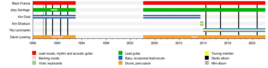 The Pixies are an American alternative rock band formed in 1986, in Boston, Massachusetts. Until 2013, the band consisted of Black Francis (vocals, rhythm guitar, songwriter), Joey Santiago (lead guitar), Kim Deal (bass, vocals) and David Lovering (drums). They disbanded acrimoniously in 1993 but reunited in 2004. After Deal left in 2013, the Pixies hired Kim Shattuck as a touring bassist; she was replaced later that year by Paz Lenchantin, who became a permanent member in 2016.