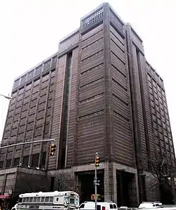 The 1902 prison was replaced in 1941 by a high-rise facility across the street on the east side of Centre Street. The 795,000 square foot[11] Art Deco architecture facility was designed by architects Harvey Wiley Corbett and Charles B. Meyers.[12][13]