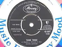 "Think Twice" is a song by Brook Benton which reached No. 11 on the Billboard Hot 100 singles chart in 1961.[1][2] The song was written by Joe Shapiro, Jimmy Williams, and Benton's regular songwriter Clyde Otis, and was released on Mercury Records with the B-side "For My Baby" also co-written by Clyde Otis, with Willie Dixon.