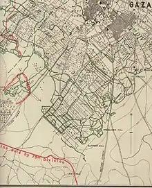 On 1 November, the assault of Umbrella Hilla sand dune two thousand yards (1,800 m) south–west of Gaza to the west of the Rafa to Gaza road overlooking the main objectiveswas to begin at 23:00.[37][38][50] The defending garrison was "assumed to be about 350 strong".[40] However, at 10:50 a preliminary move into No Man's Land was observed by Ottoman soldiers in Fisher's Orchard, who gave the alarm and began firing machine guns and rifles from the Ottoman trenches on Umbrella Hill.[51] At 23:00, an intense EEF bombardment began enabling a tape to be laid, along which the attacking troops formed up to launch their attack ten minutes later.[51] Under cover of the intense ten-minute bombardment, the 1/7th Battalion, Scottish Rifles with one company of 1/8th Battalion, Scottish Rifles (156th Brigade, 52nd (Lowland) Division) attacked Umbrella Hill.[49] After killing many of the defenders, they quickly captured the hill, three officers, fifty-five Ottoman soldiers, three Lewis guns and numerous bombs. The attackers suffered light casualties; however the sand dune was difficult to defend because the Ottoman trencheswithout revetmentshad virtually disappeared during the previous bombardments. The following Ottoman bombardment of Umbrella Hill caused 103 casualties to the 1/7th Battalion Scottish Rifles during the next twenty-four hours.[51] However, with the hill captured by the 52nd (Lowland) Division, the main attack could begin.[37]