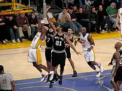 On July 16, 2003, Duncan signed a seven-year, $122 million contract with the Spurs.[56] Before the 2003–04 season began, the Spurs lost their perennial captain David Robinson to retirement. Embracing the lone team leader role, Duncan led a reformed Spurs team which included Slovenian center Rasho Nesterović, defensive stalwart Bruce Bowen, Argentinian shooting guard Manu Ginóbili and young French point guard Tony Parker. Coming off the bench were clutch shooting power forward Robert Horry, versatile Hedo Türkoğlu and veterans Malik Rose and Kevin Willis.[57] In retrospect, Robinson commented that at first, Duncan was reluctant to step into the void, still needing some time to truly develop his leadership skills.[58] Statistically though, Duncan remained strong; after another convincing season with averages of 22.3 points, 12.4 rebounds, 3.1 assists and 2.7 blocks,[7] he led the Spurs into the Western Conference Semifinals. There, they met the Los Angeles Lakers again, split the series 2–2, and in Game 5, Duncan made a toughly defended jump shot which put the Spurs ahead by one point with 0.4 seconds left to play. Despite the little time remaining, Lakers point guard Derek Fisher hit a buzzer beater, giving his team the win.[59][60] In the end, the Spurs lost the series 4–2, and Duncan attributed the strong Lakers defense as one of the reasons for the loss.[61]