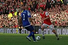 On 4 January 2010, Rosický signed a new contract with Arsenal, saying, "It's felt like home since I arrived here four years ago and I believe we're on the verge of achieving something special together."[45] Arsenal manager Arsène Wenger commented on the new deal with Rosický, saying, "I have spoken many times of Tomáš' class and contribution, not only on the pitch but off it as well, and I very much feel that this new contract reflects that."[46] Following his contract announcement, Rosický scored an injury time equaliser in a 2–2 draw at Emirates Stadium against Everton.[47] His third goal of the season came against Bolton, Rosický scoring Arsenal's first goal at the end of the first half after Bolton had taken an early two-goal lead.[48] Arsenal went on to score three goals in the second half, winning the match 4–2.[48] On 10 February, Rosický provided a cross for teammate Abou Diaby, who resultantly scored the solitary goal of their league match against Liverpool.[49] Rosický finished the season with a total of three goals in 33 appearances in all club competitions.