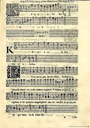Victoria published his first book of motets in 1572.[22] In 1585 he wrote his Officium Hebdomadae Sanctae, a collection which included 37 pieces that are part of the Holy Week celebrations in the Catholic liturgy, including the eighteen motets of the Tenebrae Responsories.[23]