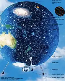 The Video Airship is an ongoing project which weaves together several themes in Shannon's work. In the late 60's Shannon proposed spherical televisions linked to orbiting camera satellites. Buckminster Fuller had earlier proposed a 200-ft sphere covered with lights to display Earth to the United Nations. Shannon designed a LED-covered spherical blimp with cameras that could land at school campuses and other public locations to deliver education and at night host rave dances.[20] Aerovironment, Inc., the engineering firm founded by aeronautics legend Paul MacCready, found the design feasible; it can be aerodynamically controlled and can present clear computer video in daylight.