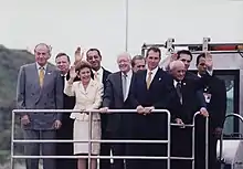 Support for the treaties came from a variety of interests, including the Joint Chiefs of Staff and members of Congress, such as Ernest Hollings, Hubert Humphrey,[12] and most importantly Howard Baker and Robert Byrd.[13] Other supporters included Admiral Elmo Zumwalt and General Maxwell Taylor;[14] John Wayne, who was friends with Omar Torrijos,[15] AFL-CIO president George Meany, statesmen Averell Harriman, Dean Rusk, George Ball, Henry Cabot Lodge, and John Sherman Cooper, and former first lady Lady Bird Johnson.[16] More moderate conservatives, including President Ford and Henry Kissinger, both made public statements in support of the treaty.[17] Organized efforts to promote the treaties came from the Committee of Americans for the Canal Treaties and New Directions.[16] Many world leaders also came out in support of the treaties, including positive statements from the leaders of Barbados, Bolivia, Dominican Republic, Guatemala, Guyana, Nicaragua, Peru, Chilean president Augusto Pinochet, Costa Rican president Daniel Oduber, and Venezuelan president Carlos Andrés Pérez.[18]