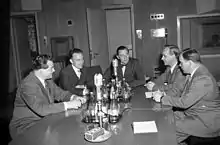 Radio interview, ahead of elections in 1950. From the left; Herbert Claesson (Social Democrat), Holger Wigerz (Liberal), Jarl Hjalmarson (Conservative), Knut Olsson (Communist) and Torsten Andersson (Farmers' League).