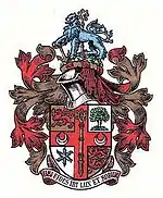 Tranmere first introduced a badge on their shirt in 1962, wearing the coat of arms of the borough of Birkenhead, along with adopting their motto "Ubi fides ibi lux et robur", meaning "Where there is faith there is light and strength".[92][94] The crest was replaced in 1972 by a monogram, and in 1981 by a simplified blue and white shield. In 1987, a complex [2] heraldic crest was introduced, adapting the Birkenhead crest through the inclusion of a football and a TRFC logo. The simpler badge was adopted in 1997,[2] and modified slightly in 2009 to mark the club's 125-year anniversary.[95] The blue and white crest incorporated simplified elements of the Birkenhead civic coat of arms: the crosier and lion originally formed part of the Birkenhead Priory seal; the oak tree was a symbol of the Tranmere Local Board; the star or starfish represents Bebington; the two lions represent Oxton; and the crescents may represent the Laird family.[96]