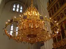 The domes are covered with gold–plated stainless steel. The crosses are made of the same material. The central dome weighs 26 tons; its construction required the use of a special custom crane.