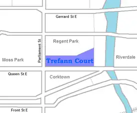 Trefann Court is a small neighbourhood in the eastern part of downtown Toronto, Ontario, Canada. It is located on the north side of Queen Street between Parliament Street and River Street. It extends north only a short distance to Shuter St.